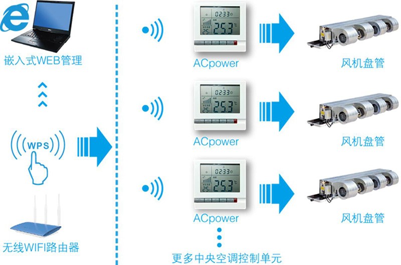 ZHT-ACpowe中央空調(diào)智能溫控器標準支持 802.11b/g/n無線標準,使用STA/AP 共存工作模式,標準模塊使用WIFI通訊進行組網(wǎng)(其它通訊模式可定制),系統(tǒng)組網(wǎng)應用圖如下: